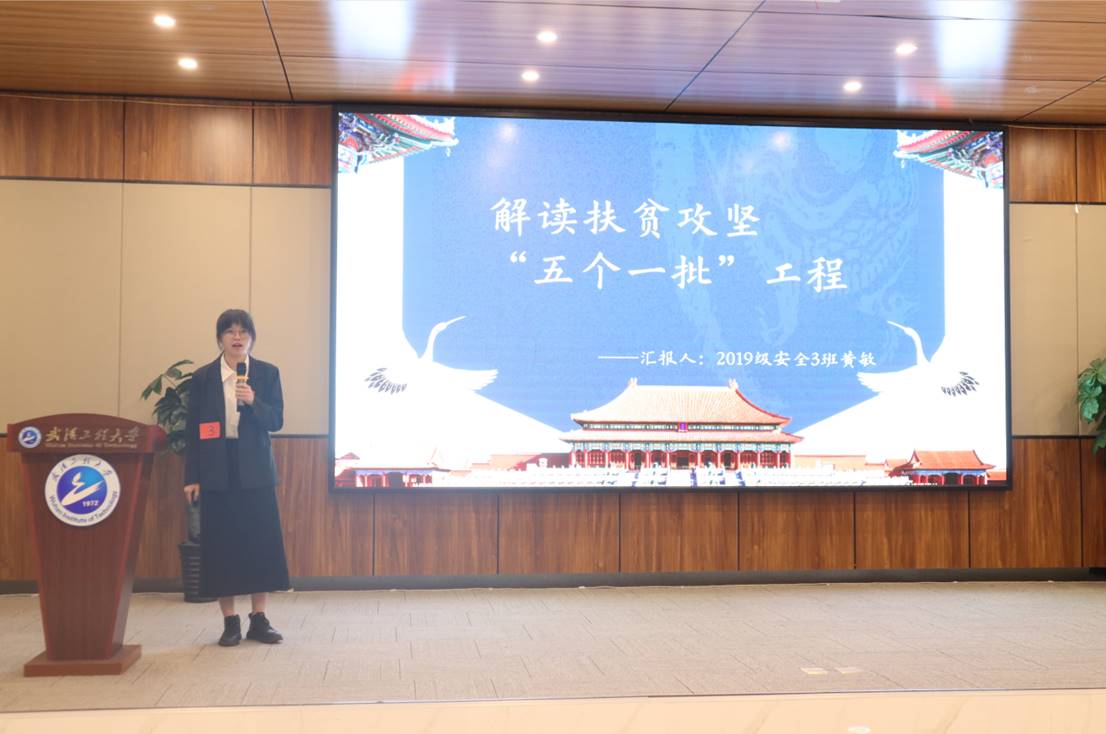 获得二等奖的第三组选手是来自资源与清静工程学院的黄敏,,,,,,,她演讲的主题是“解读脱贫攻坚“五个一批”工程”。。。。。她指出,,,,,,,五个一批工程基本涵盖了种种贫困生齿,,,,,,,是党关于贫困生齿绝不落下一户的坚定允许,,,,,,,是党在实践中总结出来的生动履历。。。。。